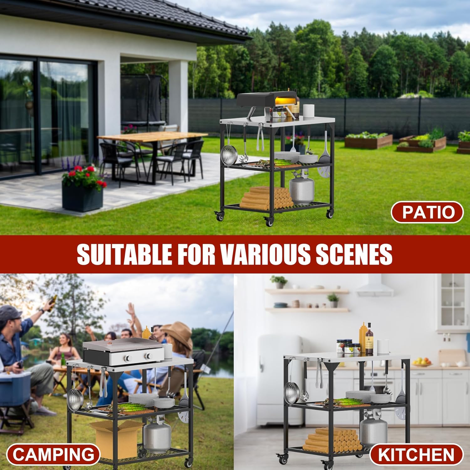 - WIDE COMPATIBILITY: The dimensions of this universal grill stand is 35.5 x31.5 x24 inch. This grill stand is compatible with a range of grills, air fryers, electric ovens and more. This outdoor grill table fits ooni pizza ovens, mimiuo pizza ovens, and other brands