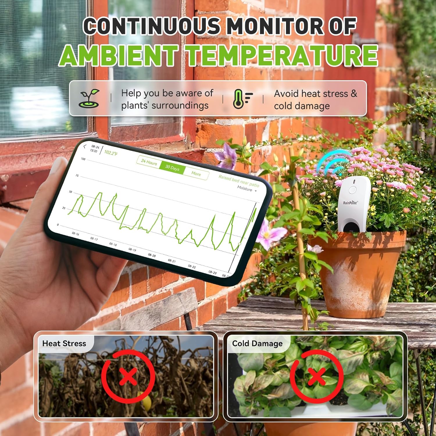 - 【Build Auto-Watering System】Connect to RAINPOINT WiFi water timers (sold separately) to adjust watering schedules based on real-time moisture levels, creating an automatic watering system. The smart system stops watering instantly when optimal moisture levels are reached. Its light/temp sensor helps maintain the right balance, ensuring your plants thrive and stay healthy.