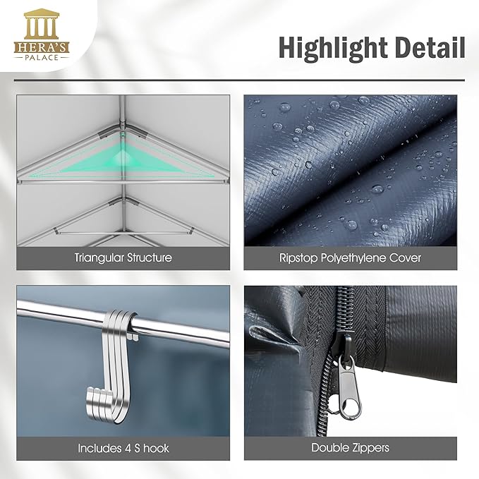 - Heavy Duty Metal Frame: The storage shed is constructed with a galvanized steel frame, with a top crossbar forming a stable triangular structure. Elastic balls are used to secure the canopy fabric, while the steel frame's bottom is supported by a square base plate for added stability. The car canopy is made of 180 g PE fabric, waterproof, sun-resistant, and durable, ensuring resilience even in rainy or snowy weather. Inside, there are 4 S-hooks for hanging and storing small items