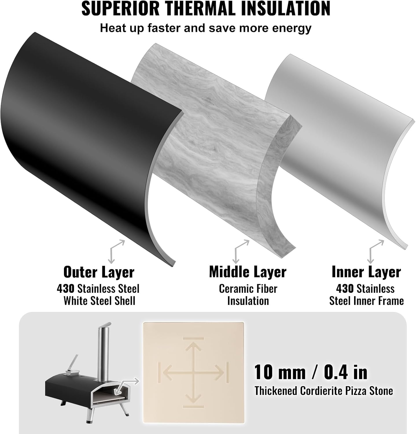 - ๐ Durable Construction: VEVOR pizza oven withstands outdoor conditions and frequent use. Adopted a 3-layer design, promoting efficient heat circulation. Featuring a 430 stainless steel shell, and thick insulation cotton, it ensures durability and excellent heat retention