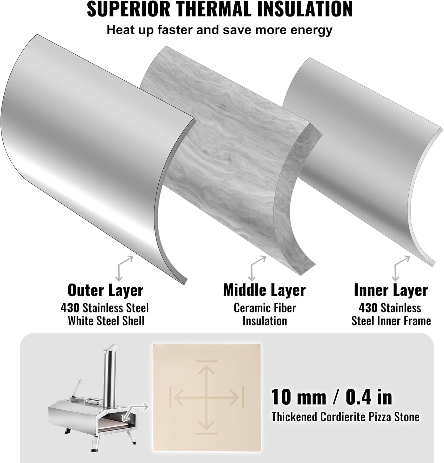 - ๐ Durable Construction: VEVOR pizza oven withstands outdoor conditions and frequent use. Adopted a 3-layer design, promoting efficient heat circulation. Featuring a 430 stainless steel shell, and thick insulation cotton, it ensures durability and excellent heat retention