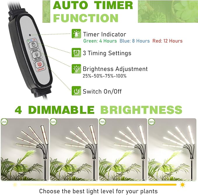 - 【4 Dimmable Levels】Indoor plant light has 4 brightness settings (25%-50%-75%-100%) to meet different kinds of plant lighting needs at various stages, such as seeding, growing, blooming, fruiting. Allowing your plants to receive more energy without concerning about damaging them.