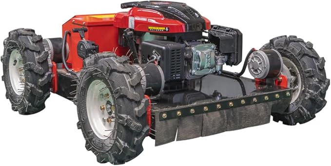 - [Working Parameters]: Traveling mode: four-wheel drive, Operation mode: remote control, Remote control distance (M): <200, Traveling motor type: brushed, Power (HP): 7.5, Cutter type: flat blade, Number of blades: 2, Fuel: 92 or above gasoline, Starting method: hand pull/electric start.