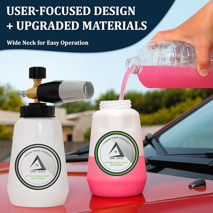 - Wide-Mouth Bottle Design: The large 1 Liter capacity container reduces the need for frequent refills. The wide mouth foam cannon design makes pouring soap into the spray foam cannon easy and mess-free, while reinforced walls prevent cracks and leaks
