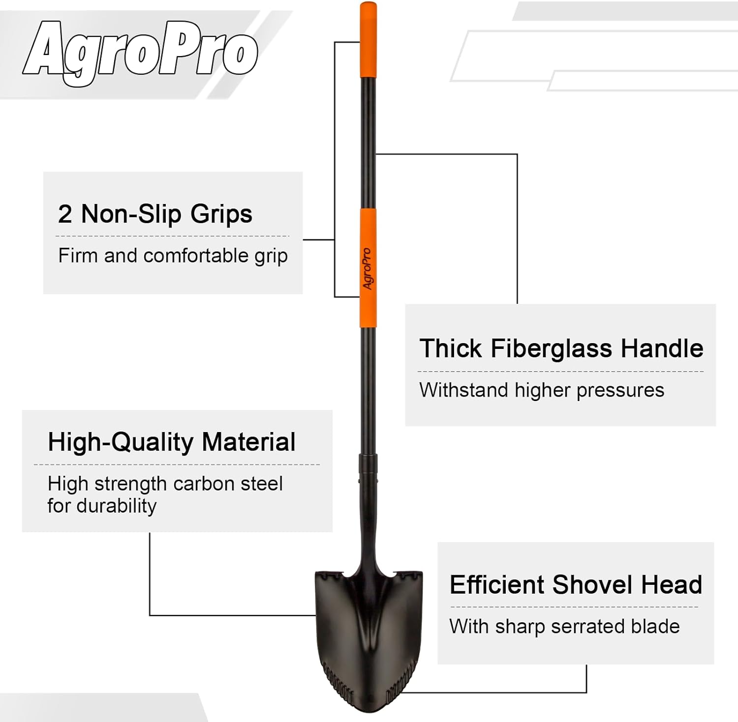 - Application: AgroPro digging shovel is an ideal tool for gardening work. It is well made and can be widely used for various gardening tasks such as garden or farmland clearing, loosening soil, transplanting crops, digging roots and tubers, and so on!
