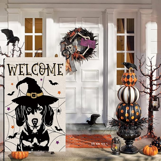 Halloween Garden Flag Dachshund Cobweb Bats Double Sided Vertical Welcome Flag Seasonal Holiday Outdoor Yard Lawn Party Decorations 12.5 x 18 Inch