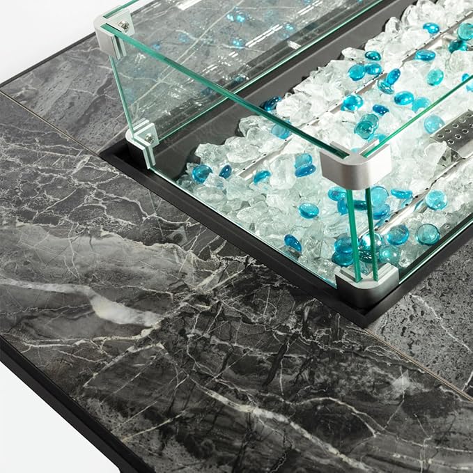 - 🔥🔥【Marble Textured Ceramic Tabletop】The propane fire pit with gorgeous marble grain tabletop surrounded with 0.394'' Tile Thickness and steel edges for better protection, Stainless steel made control panel as shinning as mirror, turning fire dancing on the glass rocks.