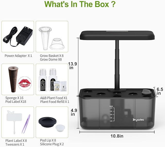 - 【Everything You Need to Start】Your hydroponics growing system kit includes: 1x Grow Machine, 1x Power Adapter, 8x Grow Baskets, 16x Sponges, A&B Nutrient Solutions, 8x Grow Domes, 8x Plant Labels, 1x Tweezers, 8x Pod Lips, 2x Silicone Plugs, and a User Manual. Just add water and your favorite seeds!