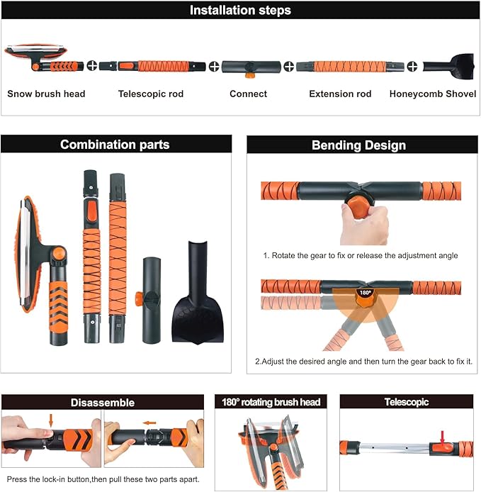 - [Easy Assembly and Storage] The entire snow removal kit is designed for easy assembly and disassembly using a simple snap-on system. It comes with clear instructions and a storage bag for convenient organization in your vehicle's trunk or cabin