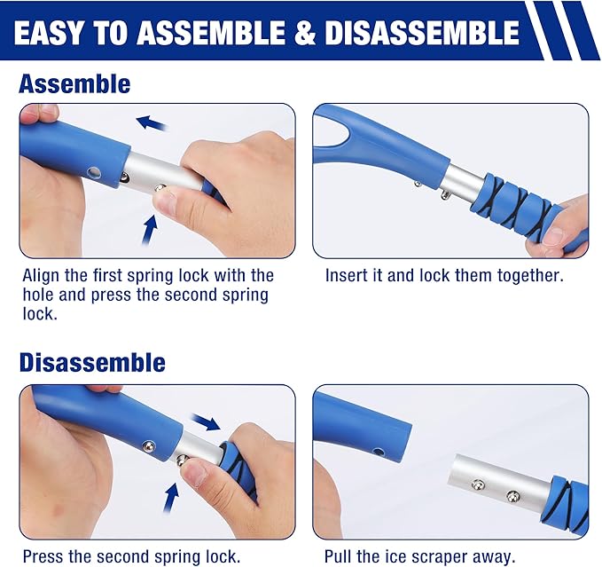 - Simple Assembly & Versatile Use: Built with a convenient spring-lock mechanism, this snow removal tool can be quickly assembled or detached. Use it as a single, compact brush for light snowfall, or switch to a powerful ice scraper for tougher buildup.