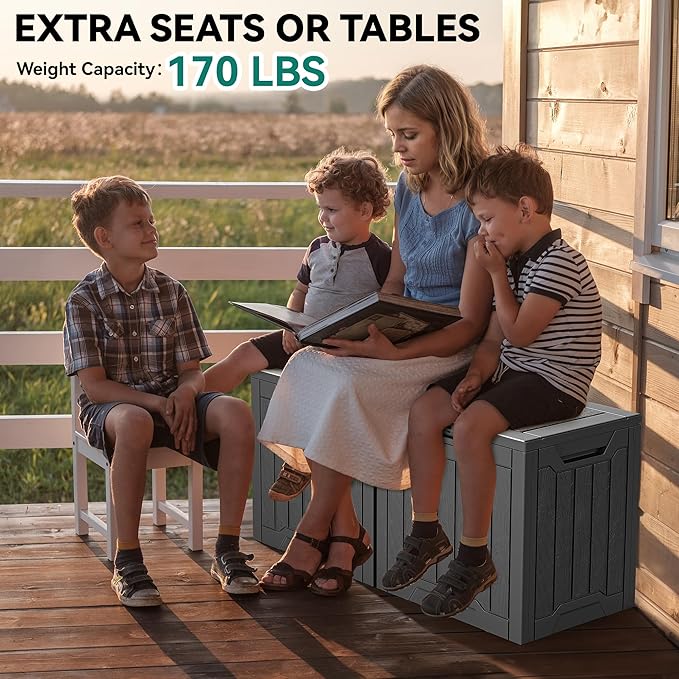 - Practical and Aesthetic: Our outdoor storage box, with a spacious 30-gallon capacity, is not just a storage solution; Its wood-like texture adds a touch of elegance to your outdoor space, and it can also be used as a bench, side table, or patio table