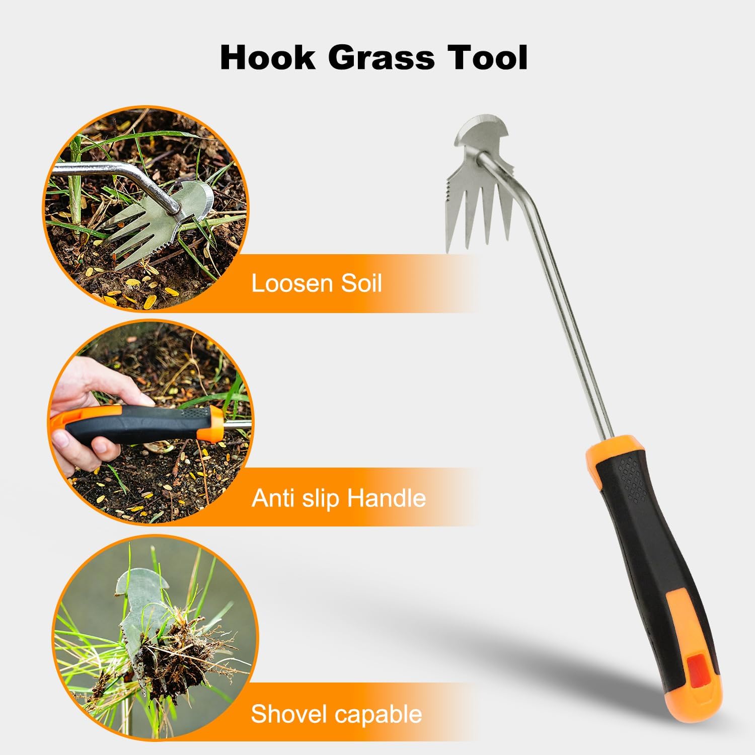 - Premium Weed Puller Tool - Serrated stainless steel blades cut stubborn roots, angled fork pries weeds intact, spade tip loosens soil. Removes deep-rooted weeds from lawns, gardens, cracks without plant damage