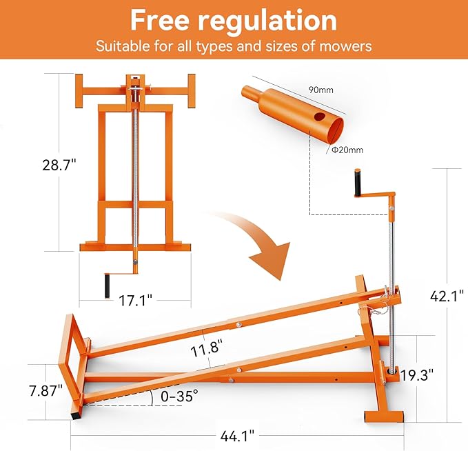 - 【Adjust the size freely to show excellence quality】The surface of riding lawn mower lift jack is coated with antirust plating, which is oxidation-resistant, abrasion-resistant, and effectively insulates against air.Adjustable design fits most home tractors and mowers,The lawn mower lift is height adjustable for easy and efficient oil changes and blade removal.Easily stored in a garden shed or garage, the mower jack is a great space saver