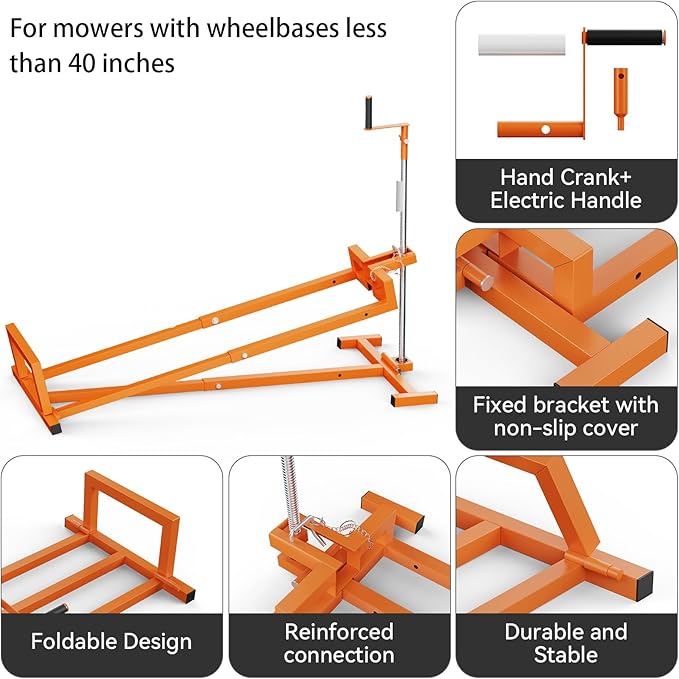 - 【Elegant Colorful idyllic time】The tractor jack is painted in a stylish orange color and is the brightest presence on your patio.Suitable for a wide range of riding lawn mowers & tractors.The operating handle is ergonomically designed to provide comfort with low noise and vibration during operation.This riding lawn mower lift also makes a great gift for gardening enthusiasts