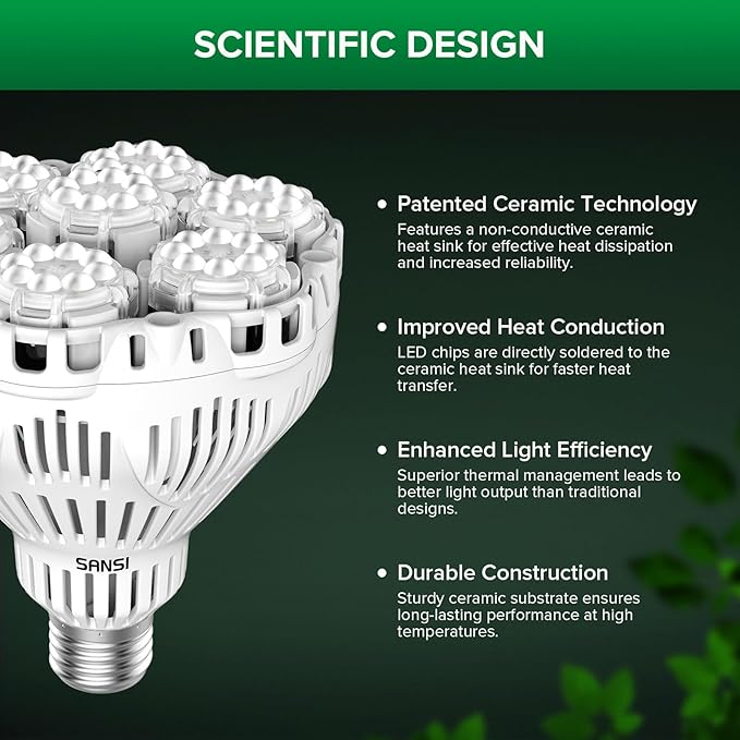 - Patented Ceramic Technology: Elevate your lighting experience with SANSI's innovative patented ceramic technology. Unlike traditional aluminum-based plant lights LED bulbs, SANSI's design features a non-conductive ceramic heat sink that directly solders the LED chip, resulting in superior heat dissipation and higher reliability. This cutting-edge technology ensures faster heat conduction, boosting light efficiency and extending the lifespan of your standing grow lights for indoor plants