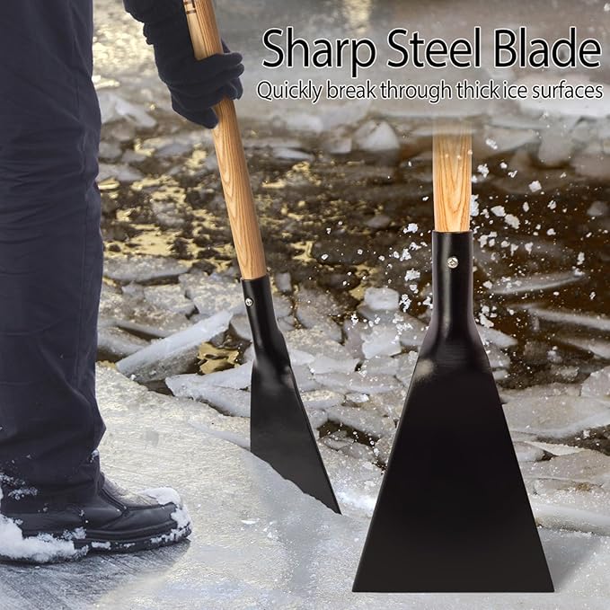 - Strong & Sharp Steel Blade: The ice chopper is equipped with high-strength manganese steel blade, which are sharp and have excellent impact resistance, and can quickly remove thick ice and hard snowdrifts on driveways, sidewalks and roads, and can easily cope with harsh environments.