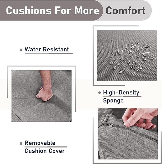 - 4" Soft Thickness Cushions: Patio furniture cushion is filled with high-density sponge and the cover is made of UV Resistant outdoor olefin fabric, which provides better comfortable seating experience. Removable zipper design, easy to replace and clean.
