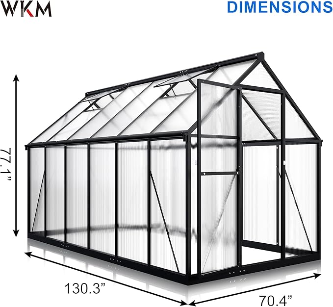 - 【Superior Stability】 Our greenhouses have overall dimensions of 130.3 “L x 70.4 “W x 77.1 “H. For added stability, you can bury the footings in soil or concrete. We have improved and reinforced the sidewalls and base to increase the resistance to wind and snow.