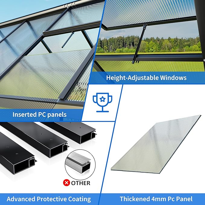 - 【Optimize Sunlight, Resistant to Wind and Snow】The panels of the greenhouse are coated with an anti-ultraviolet coating that isolates UV rays and ensures that the plants are protected from harmful rays while absorbing beneficial sunlight. High-quality polycarbonate panels and reinforced aluminum frames provide a sturdy structure that protects against wind, rain, and snow. The greenhouse can withstand storms and provide year-round protection for plants, giving them a stable place to grow.