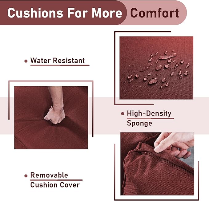 - 4" Soft Thickness Cushions: Patio furniture cushion is filled with high-density sponge and the cover is made of UV Resistant outdoor olefin fabric, which provides better comfortable seating experience. Removable zipper design, easy to replace and clean.