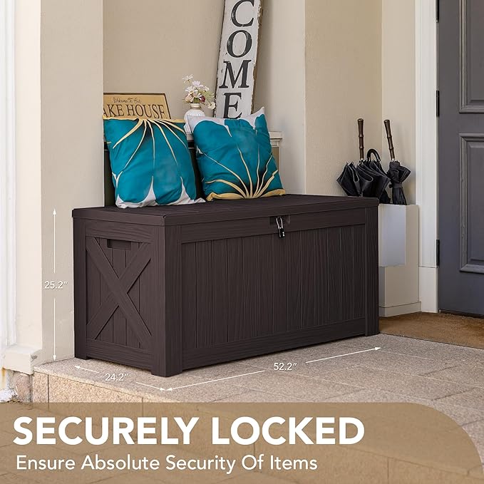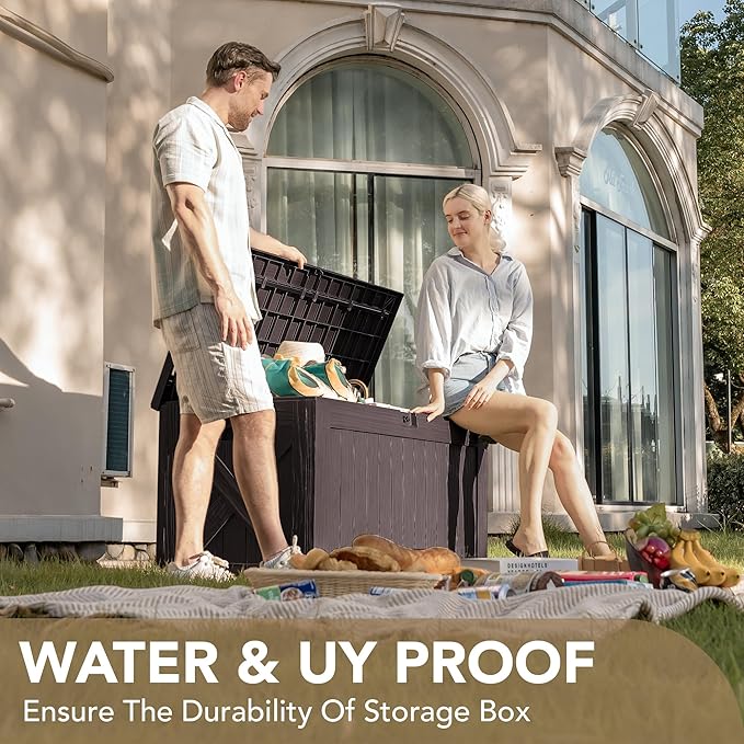 - High-quality Resin: The deck storage box is made of water-resistant resin, complemented by a wood like grain design that maintains a fresh look even with all-weather use