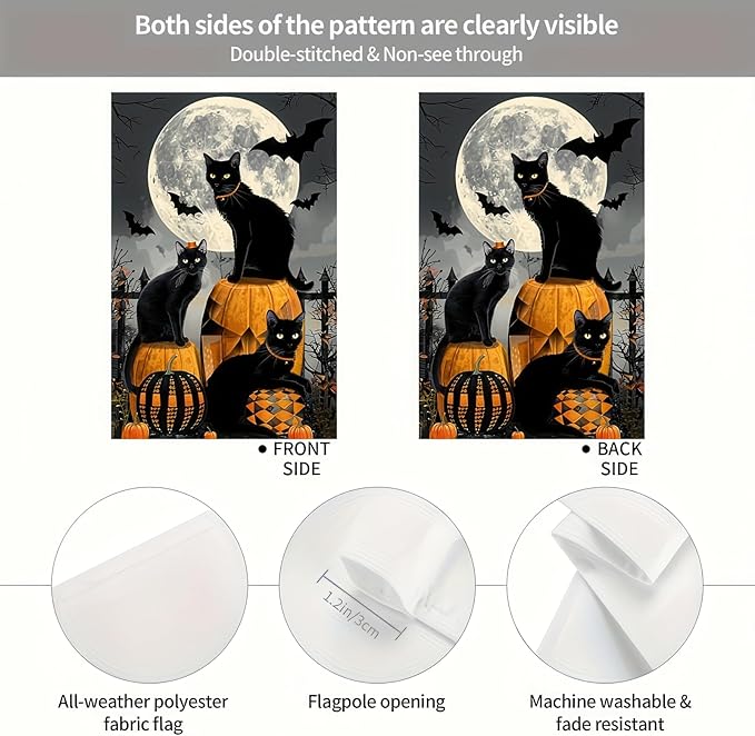 - Spooky Halloween Design: This garden flag features three black cats sitting on carved pumpkins with a full moon and flying bats in the background, creating the perfect spooky atmosphere for your Halloween décor.