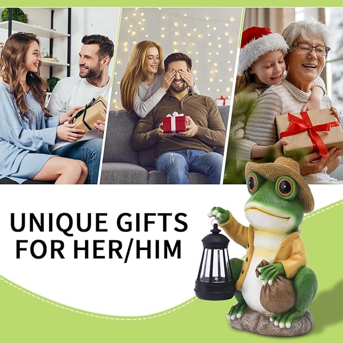 - Outdoor Garden Statues:This Frog garden statues with solar lantern measures 3.5*10*6 inches。 The statue will decorate your lawn or patio in the daytime, while providing glow at night, adding a fun and relaxing atmosphere to your porch, pond, fairy garden,yard.