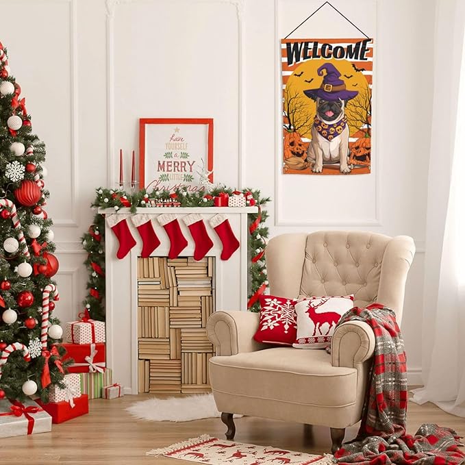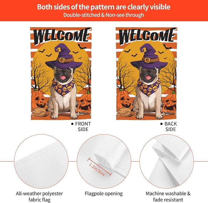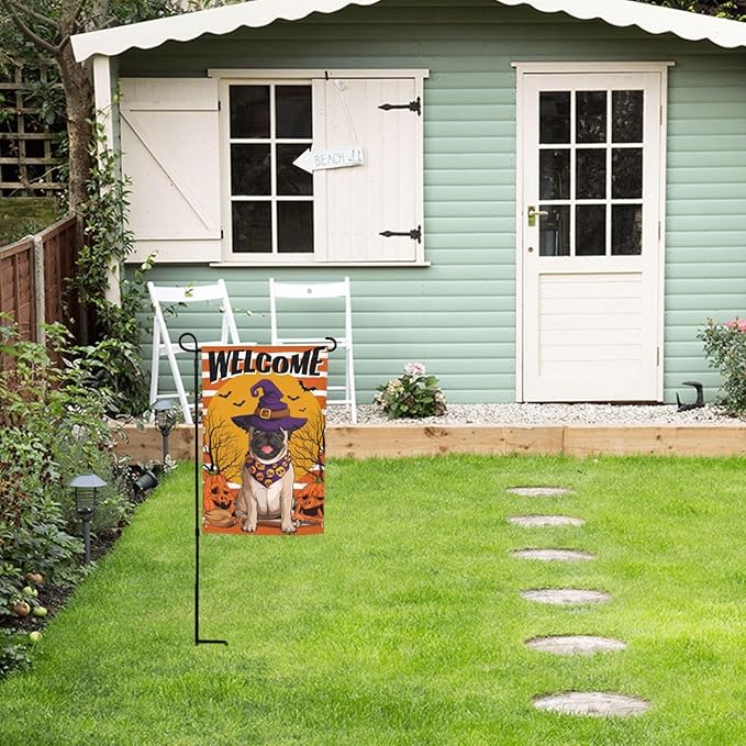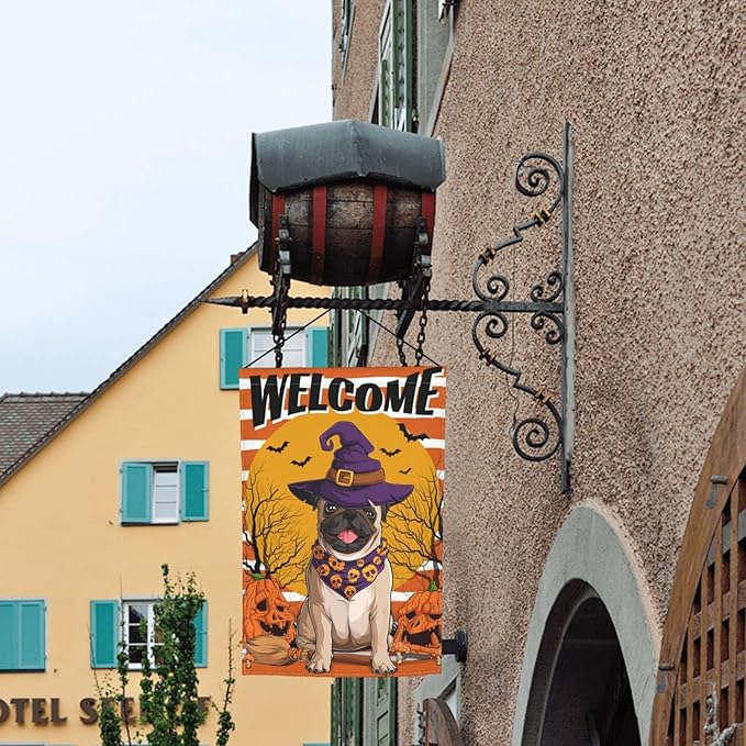 Halloween Pug Dog Pumpkin Bat Skull Garden Flag Welcome Party Outdoor Outside Decorations Picks Home House Garden Yard Decor 12x18 Inch