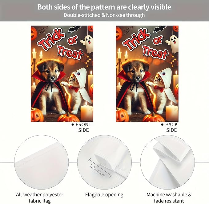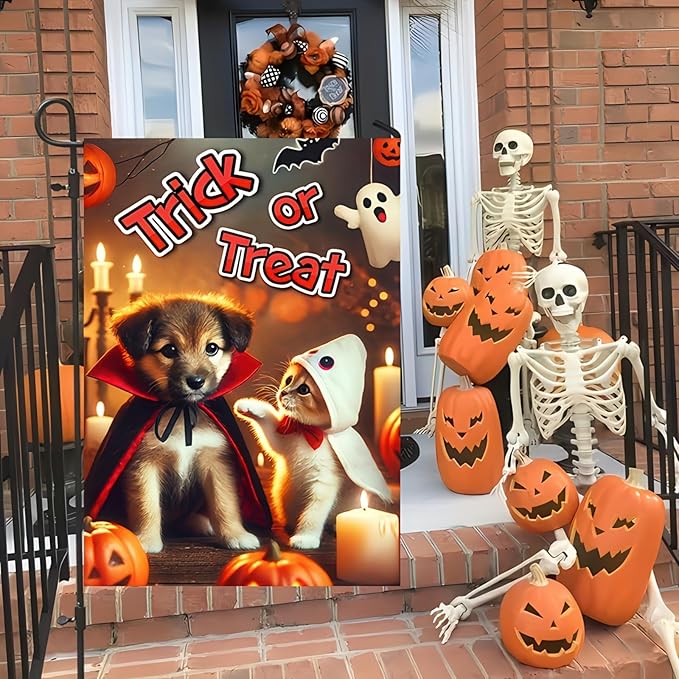 - Adorable Halloween Design:Celebrate Halloween with this charming dog and cat ghost pumpkin garden flag featuring a playful puppy and kitten dressed in spooky costumes, perfect for adding a festive touch to your outdoor decor.