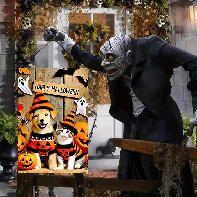 Happy Halloween Garden Flag Double Sided 12x18 Flag Cute Cat And Dog Pumpkin Garden Flag Sweaters And Witch Hats Jack-O'-Lanterns And Ghosts Outdoor Yard Lawn Decoration Banner