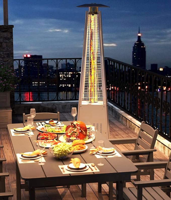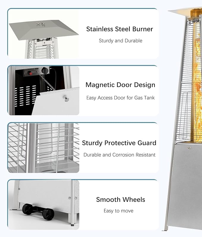 - 🔥【Portability for Multi-Scenario Use】The outdoor propane heater comes with removable wheels and is very easy to move. You can easily move the Pyramid Patio Heater anywhere you need outdoor warming which adds a fiery atmosphere to your patio, party, backyard, garden, deck, restaurant.