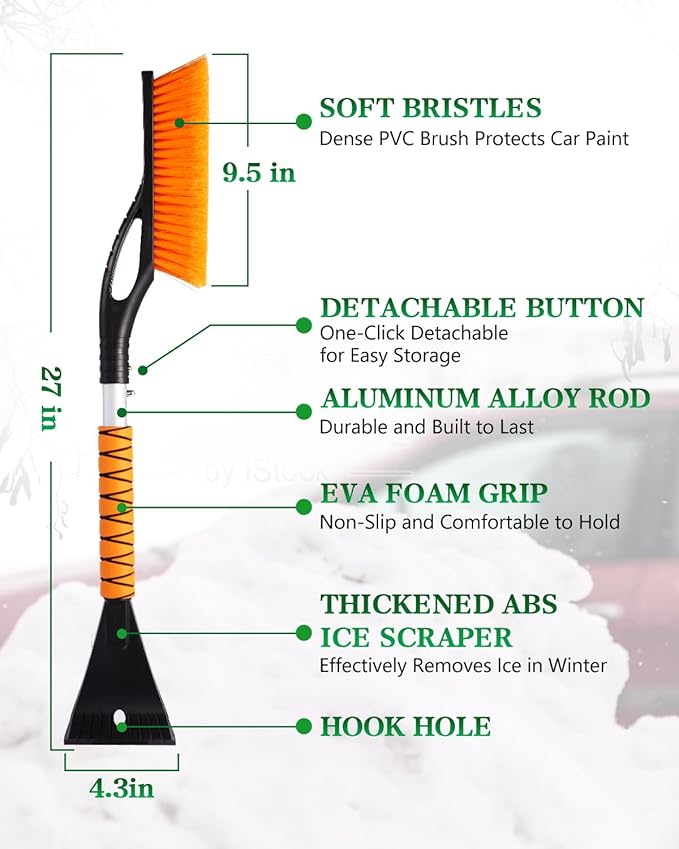 - Universal & Portable: The snow brush is 9.5 inches, and ice scraper is 4.3 inches wide and can effectively scrape ice, with a total length of 27". Detachable's design makes it more compact and easy to store without taking up space inside the car