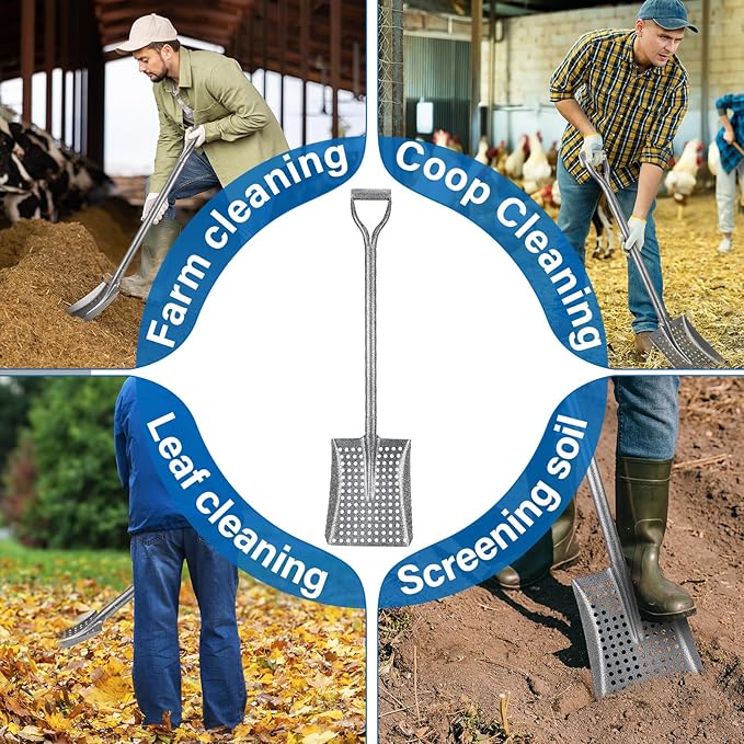 - Professional Digging&Sifting: Specially designed with dense holes, the hole diameter of this shovel is about 0.43 inches, in order to remove the feces of chickens and livestock, keep your farm clean and tidy. Also enjoy summer fun searching, digging and sifting in the sand and beach