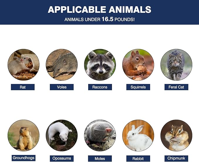 - Wide Application: Our animal trap cage is a versatile solution for various small animals. With its 31"x11"x13" size, it provides ample space for the targeted animals. It is not only a great squirrel trap in the backyard, but also a possum trap near the chicken coop. It is also highly suitable for catching stray cats, raccoons, rabbits and skunks. Specially designed for animals weighing UP TO 16.5 POUNDS! (Not for use on adult animals!)
