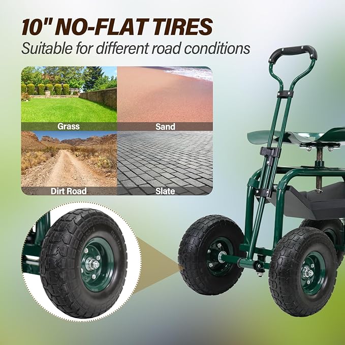 - Durable Rubber Tires - Equipped with four 10ββ wheels, this rolling garden stool moves smoothly on grass, gravel and concrete roads. And the pattern on the surface of the tire enhances stability and prevents skidding on wet ground