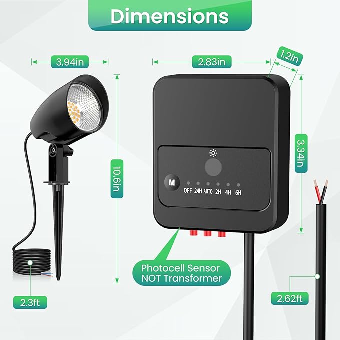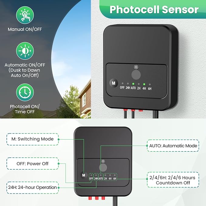 - 【Multiple Modes】 The Photocell Sensor offers 3 modes of operation, including manual on/off(24H operation/manual off), automatic ON/OFF (dusk to dawn), photocell ON/timer OFF. The multiple setting modes are designed to meet a range of customer needs and help to maximize energy savings