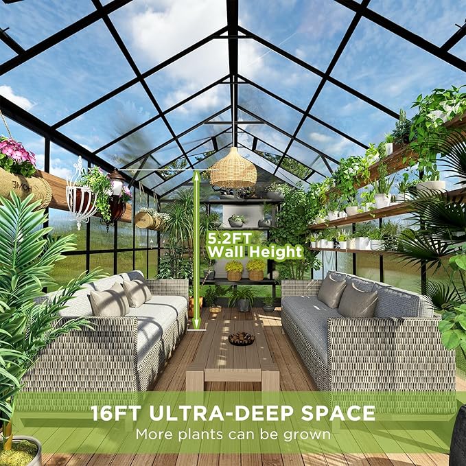 HOWE 8x16x7.5 FT Polycarbonate Greenhouse with Swing Doors, 4 Vents, 5.2FT Added Wall Height, Walk-in Large Aluminum Greenhouse for Outdoors, Black
