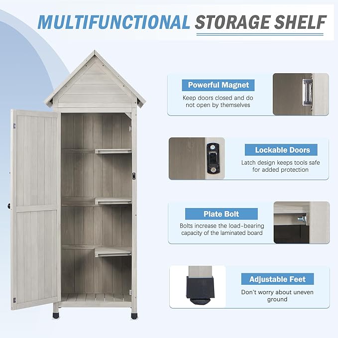- Adjustable Feet: Featuring 4 adjustable feet, our tall outdoor storage cabinet maintains perfect stability even on uneven surfaces. Its durable construction ensures you'll enjoy using this patio storage shed for years to come.