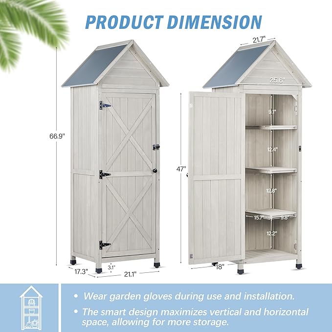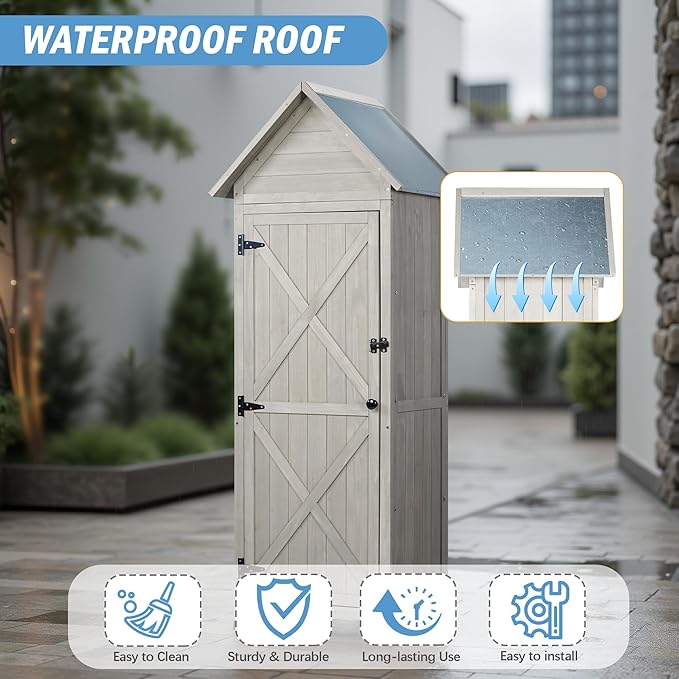 Wooden Outdoor Storage Cabinet,Tall Vertical Garden Tool Shed with Waterproof Metal Roof & Adjustable Feet – Perfect for Yard, Patio, Lawn & Deck (Gray, 22" x 26" x 67")