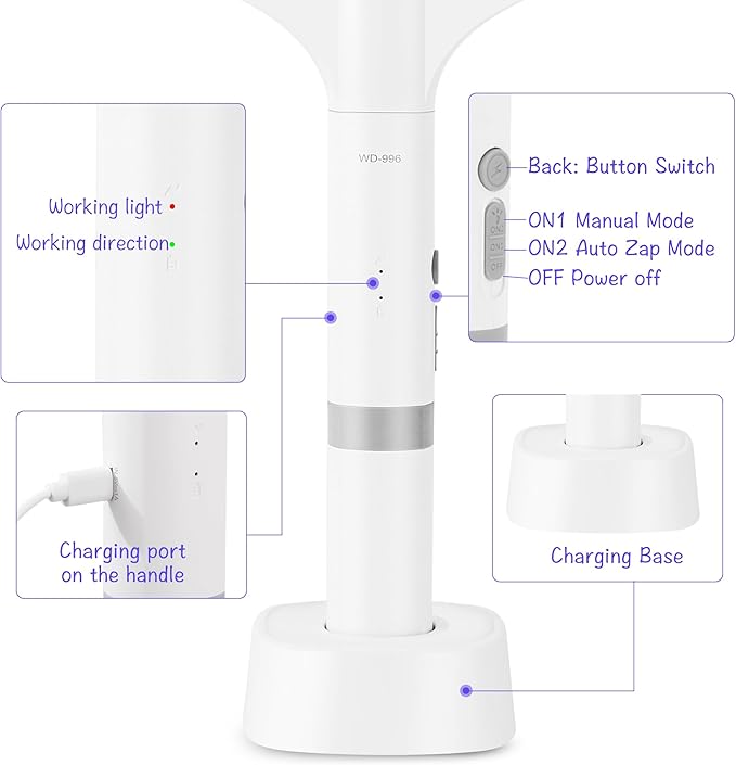- 2-in-1 Electric Fly Swatter: ON1 manual mode, press and hold the high-voltage button can kill flying mosquitoes. ON2 auto mode, the electric bug swatter is placed into the charging base, purple light high-pressure will attract insects to the high-volt grid and then shock them.
