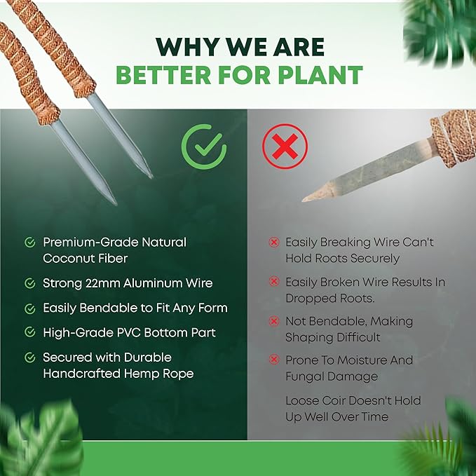 - 【Premium Material】 This plant support poles are crafted from coco coir, a premium natural material that offers an organic support system for climbing plants. The inner core of the bendable moss pole is made of 20mm solid aluminum bar, which is strong rust-free, and easy to adjust the shape. Known for its exceptional water retention, coco coir creates an optimal environment for roots to thrive, providing enduring support for your climbing plants.