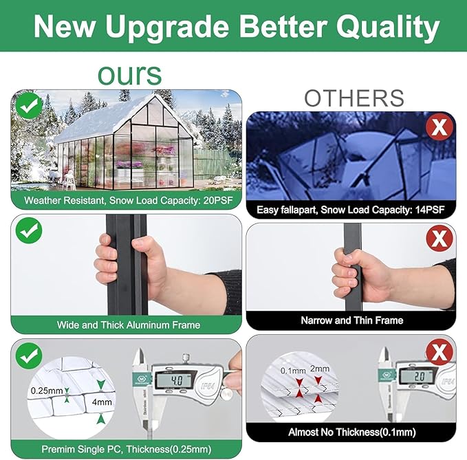 - Sturdy Frame: Our greenhouse kit boasts a robust rust-resistant aluminum frame designed to withstand various weather conditions. 2 skilled enthusiasts can assemble this greenhouse kit within just 4-6 hours. Introducing patented technology, Easy assembly, saving you 50% of your time. Gone are the days of tedious setups. With a simple push and locking screw, our Quick Connect ensures a reliable, secure, and swift link-up. It can also support snow loads of up to 20PSF
