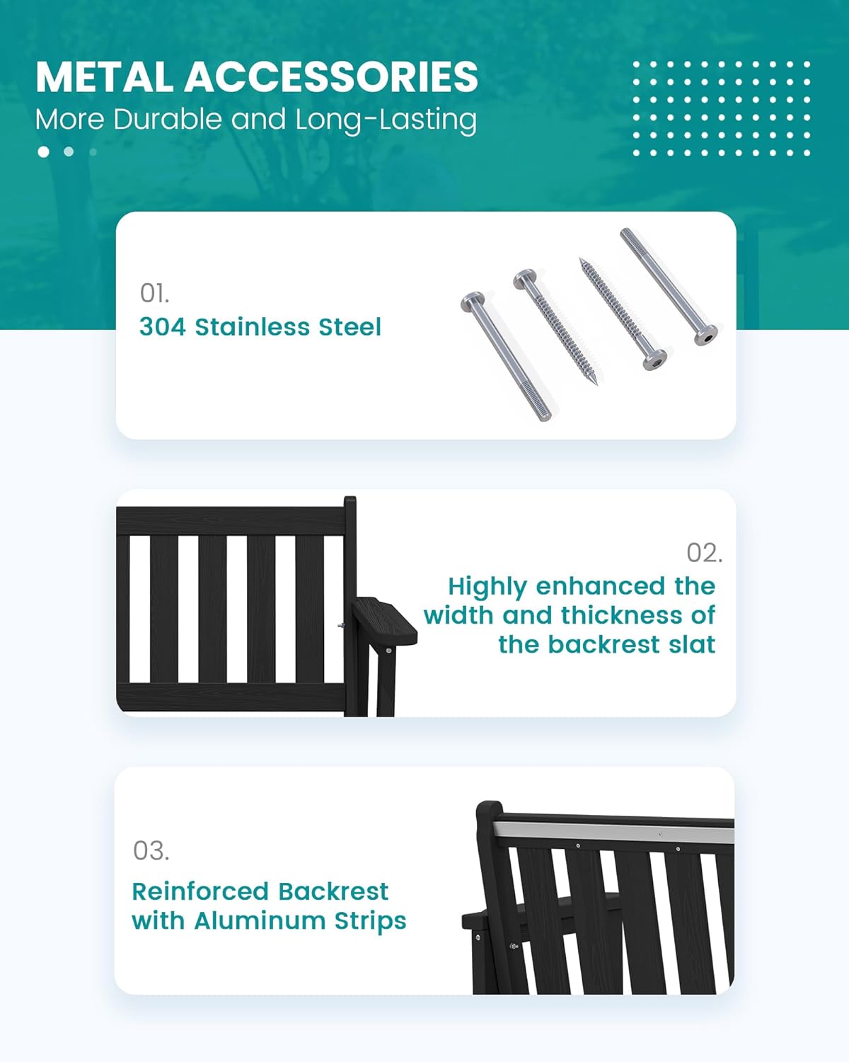 - Reinforced Aluminum Bar: SERWALL garden benches for outdoors are built to last, with sturdy aluminum strips reinforcing the backrest for added durability without compromising comfort. The reinforced chair is more durable and resistant to deformation, ensuring long-term outdoor use.