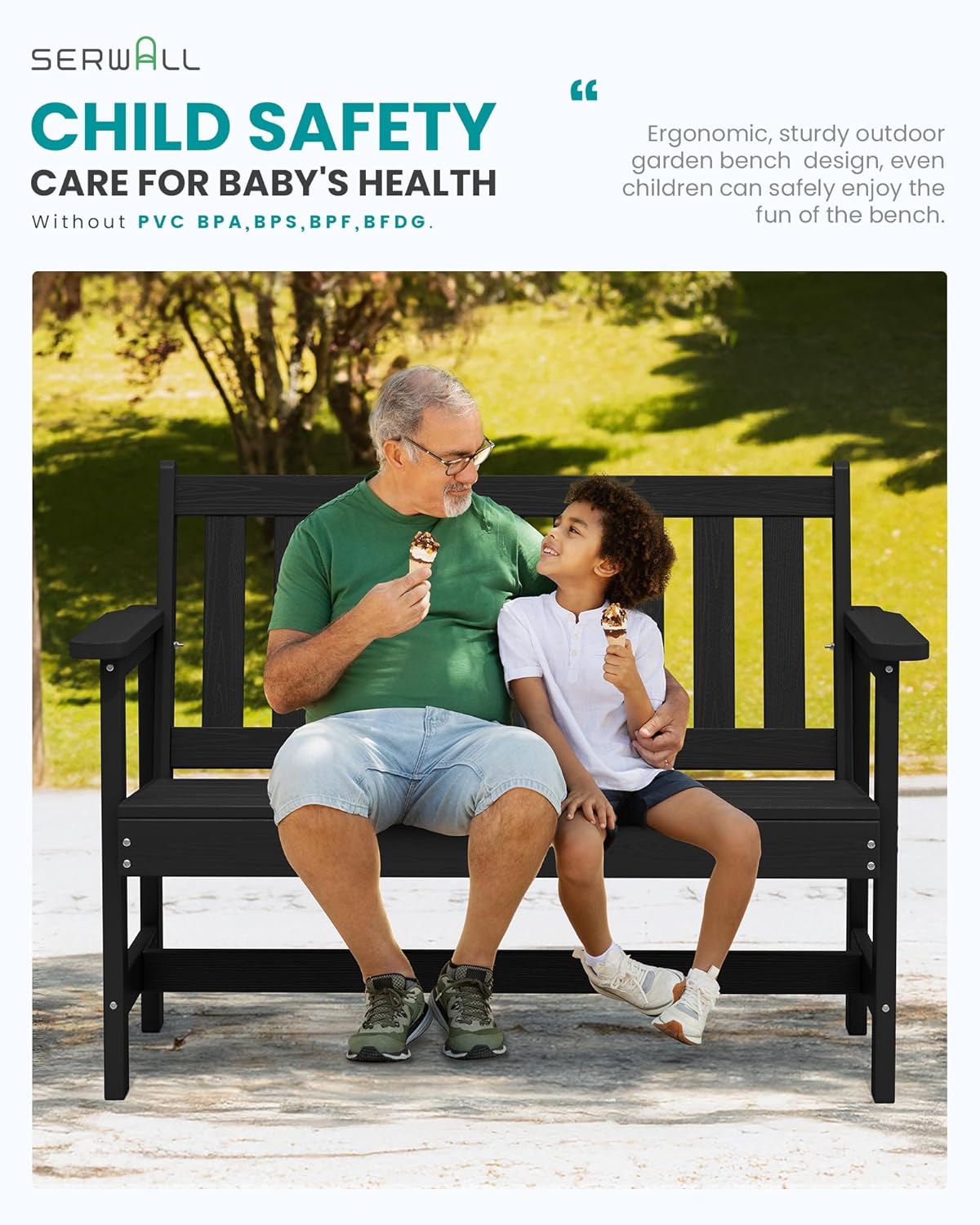 - All-Weather Resistant: The SERWALL garden bench is made of durable high-density polyethylene (HDPE), along with 304 stainless steel hardware, making it resistant to various weather conditions and ensuring long-lasting durability. It is an ideal choice for any outdoor environment.