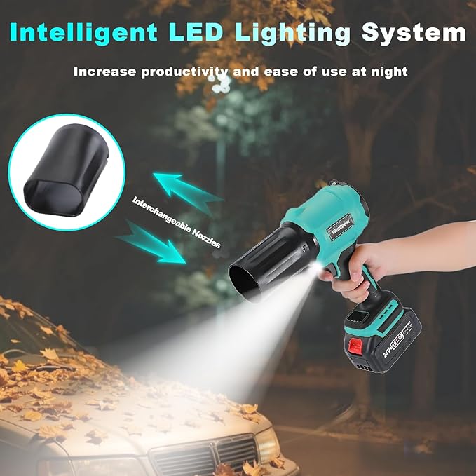 - 【All-in-One Convenience】This powerful battery leaf blower includes 2 versatile nozzles and a built-in LED light for enhanced visibility, making it ideal for a wide range of tasks such as cleaning your yard, clearing leaves, dusting hard-to-reach areas