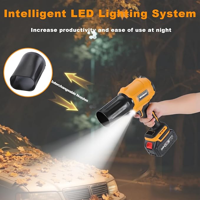 - 【All-in-One Convenience】This powerful battery leaf blower includes 2 versatile nozzles and a built-in LED light for enhanced visibility, making it ideal for a wide range of tasks such as cleaning your yard, clearing leaves, dusting hard-to-reach areas