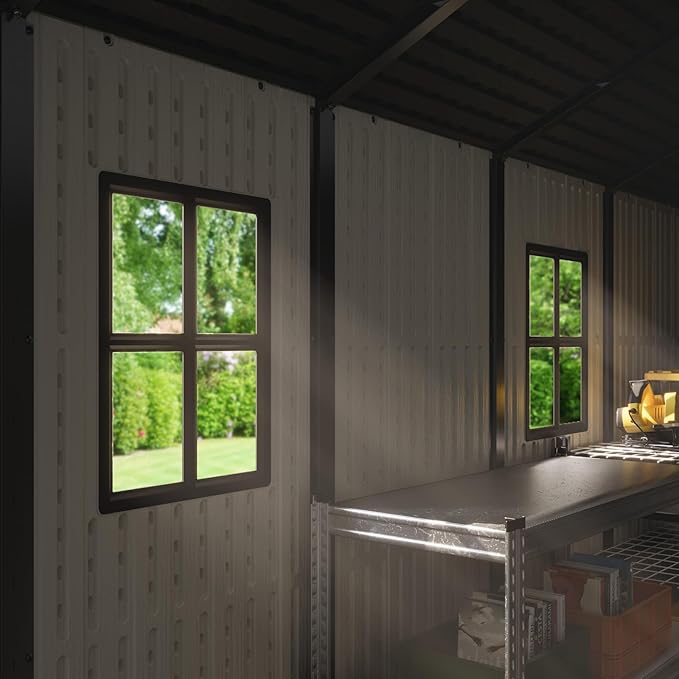 - Four Windows Design: Allows natural light to illuminate the interior, reducing the need for additional lighting; Provides a pleasant view of the surroundings; Enhances security by allowing visibility of the shed's contents. And the position of the window can be adjusted according to your needs with the wall panel.
