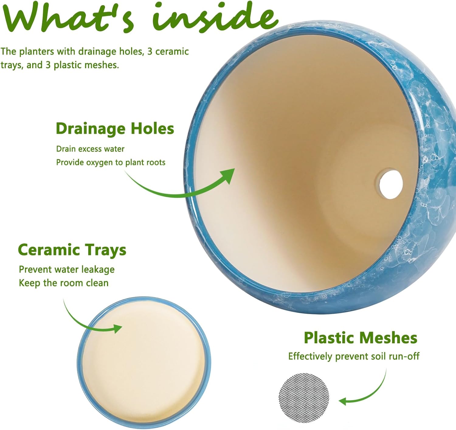 Ceramic Plant Pots - 10+8+6 Inch Modern Round Planters for Indoor Outdoor with Drainage Holes and Plant Saucers, Room Patio House Office Decor, Gardening Gifts for Women Men, Set of 3, Blue