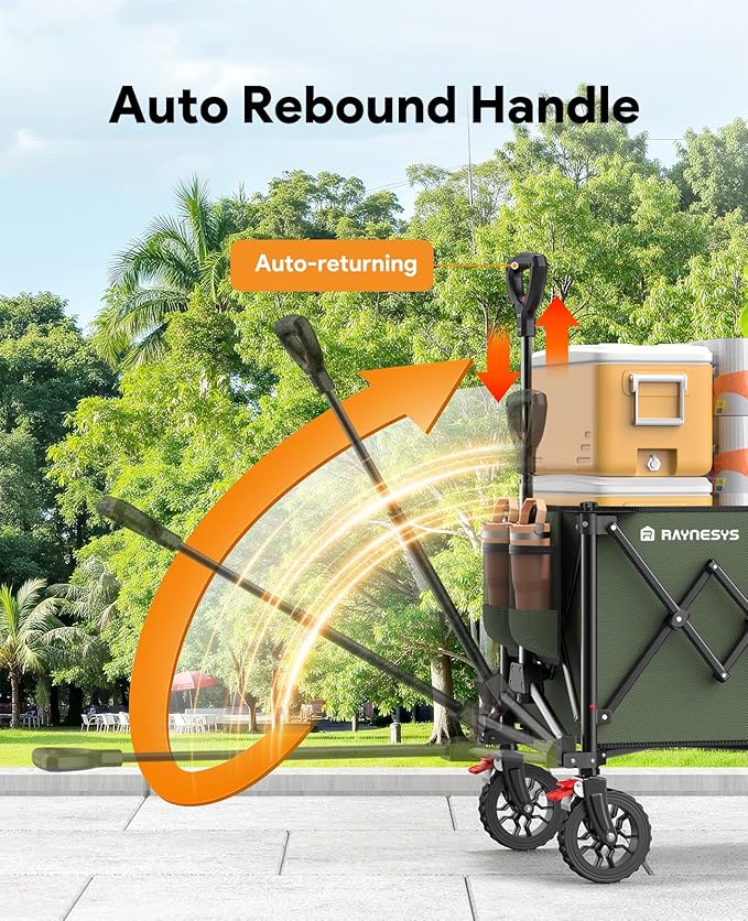 - The handle of collapsible wagon cart foldable has auto rebound function. It can automatically return to its original position, without touching the ground and tripping others. This collapsible wagon is designed with 2 cup holders and 1 back pocket for extra storage. You can put water bottles, umbrellas, and other camping equipment.
