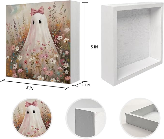 Mtrgdn Cute Halloween Decor,Halloween Decorations Indoor,Ghost with Bow Flower Desk Decor Wooden Box Sign,Halloween Home Office Kitchen Bathroom Bedroom Coffee Bar Table Shelf Wall Decorations,5x5 In